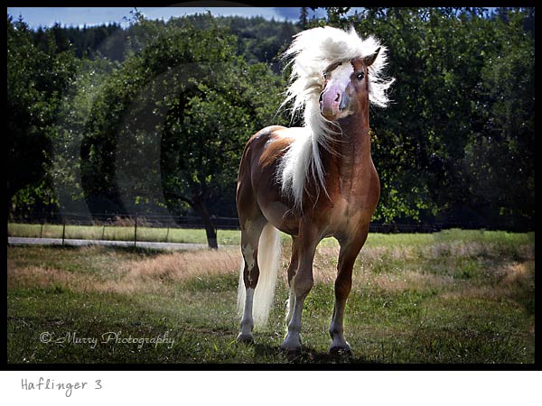One of my cousin's Haflinger stallion. I just love him he's a sweetheart as well as being beautiful. I am now training her 3 yr old thoroughbred gelding who is 17 hands and a grandson of Secretariat. I love having a cousin with awesome horses lol.
