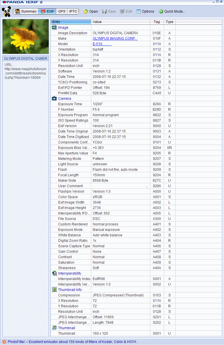 The great thing about modern DSLRs like the E510 is that most of the shooting info is stored in the metadata, EXIF and IPTC. Just about any viewing program these days gives you access to this data. Below is all the EXIF data from your shot displayed in Opanda's IEXIF program. This is a free download that allows you to right click on a web image and display the EXIF data. As you can see you were shooting at f/5.6 which explains the shallow DOF.