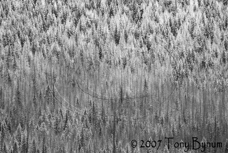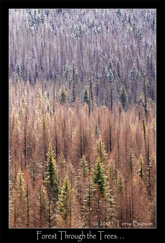 While in search of Mountain Goats the other day (I found some but was not able to get on them), in the timber no less, I was able to capture some interesting tree shots. Tree shots are always more involved than one thinks. For me, the tree shots are some of the most exiting to photograph because it's so much more than pointing a camera at a large landscape and snapping a picture (I know some might think thats what my shots look like, but it's much more chalanging to get something good than you think, nonetheless, shooting them makes me feel more balanced between framing wildlife and letting my mind wonder, to shoot landscape abstracts, no matter how they turn out). If you have a place where you can see large tree scapes and you begin to look them over, it becomes clearer that trees really do make up a forest. Patterns become apparent and the subtle changes show up the longer you look. This looking into the forest through the trees, or visa-versa has to be done quickly especially if the light and temperature are changing rapidly. What once could have been a very good shot may just fade behind a cloud or the frost on the tree goes away, etc. Once also can get caught up in the procrastination or the pressure to shoot something well and it becomes difficult to pick out one or two shots from a million acres of trees. I just try to relax and feel the calmness of the place then shoot away.