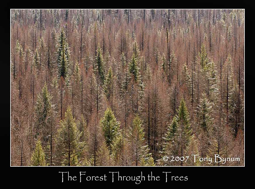There are few things I have learned over the years of photographing tree-scapes. First, it seems that shooting at between 100 and 200mm on a 1.5 factor dslr gives me the best results. It also seems that tighter in camera crops work better too. Once the trees start to become indistinguishable the shots, for me start to fall apart – but I’ll bet for some, that’s when they just start to come together!