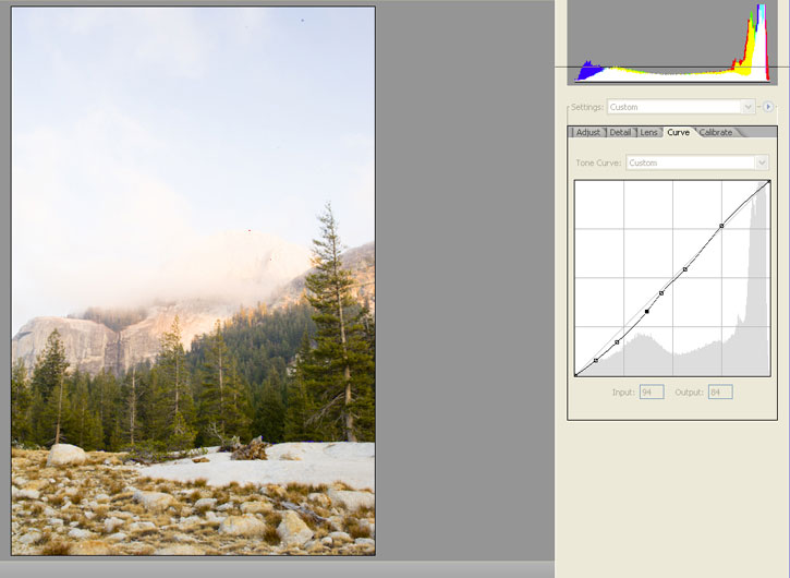 (2) Ignore the shadow information, just pay attention to the highlights. If they are clipping, adjust the curves to get the proper mood. As best as you can, try to remember the scene when you shot it. I adjusted it like this: